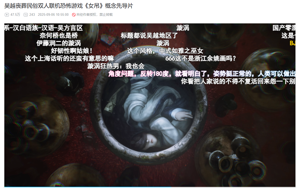 当然,这不是《女吊》第一次引发关注。早在今年9月6日,也就是农历中元节当天,游戏官方就已经放出过一部概念先导片。