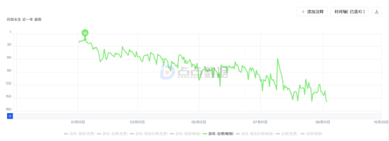 不过到了下半年,游戏整体表现有所消退,榜单排名一路下滑至159名,随后在上个月飞榜,至今仍未回到榜单之上。据最新财报显示,《问剑长生》1-9月的流水为7.13亿,是吉比特旗下收入排名第三的产品。