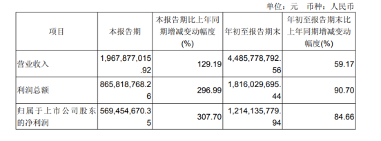 假如我们将第三季度单拎出来看,数据更加亮眼:营业收入为19.7亿元,同比上升129.2%;归母净利润为5.69亿元,同比上升307.7%;扣非归母净利润为5.64亿元,同比上升273.7%。