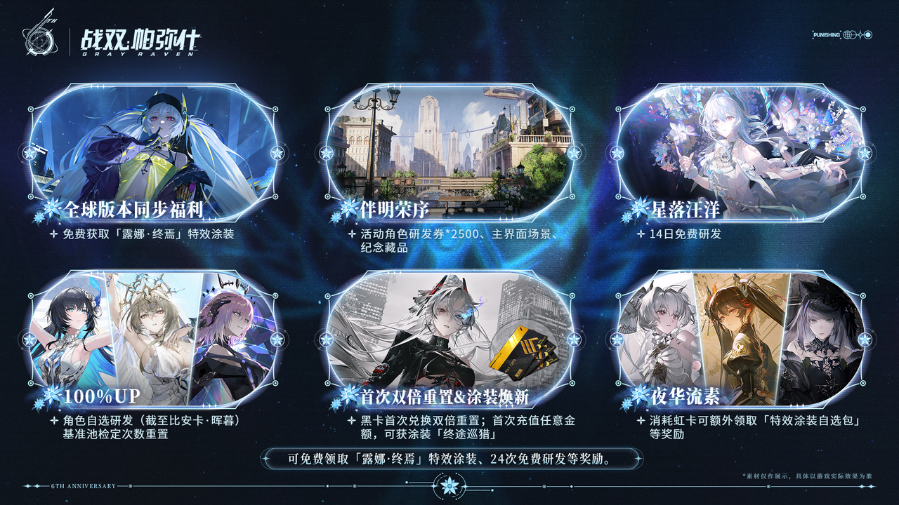 而在福利方面,六周年也称得上相当有诚意。除了周年惯例的活动池十连、14次单抽、100%自选卡池、基准池检定重置、周年主界面外,新手签到奖励也焕然一新,新增1500基准研发券和自选专武(截止到露娜·终焉)。为了庆祝首次全球同步,玩家上线就能领到露娜的全新特效涂装,之前充值过的玩家还能直接获得新加入首充奖励的阿尔法涂装。