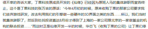 此后,丁果科技被一家名为华芯飞的硬件公司投资并收购。双方曾合作开发了另一款游戏《天地道》,但据称华芯飞成为母公司后,要求团队转向开发3D界面,而非继续专注于游戏研发,并且在《天地道》上线后也未提供销售报表,存在不公的对待。理念的严重不合,导致丁果科技的原班人马最终集体辞职。