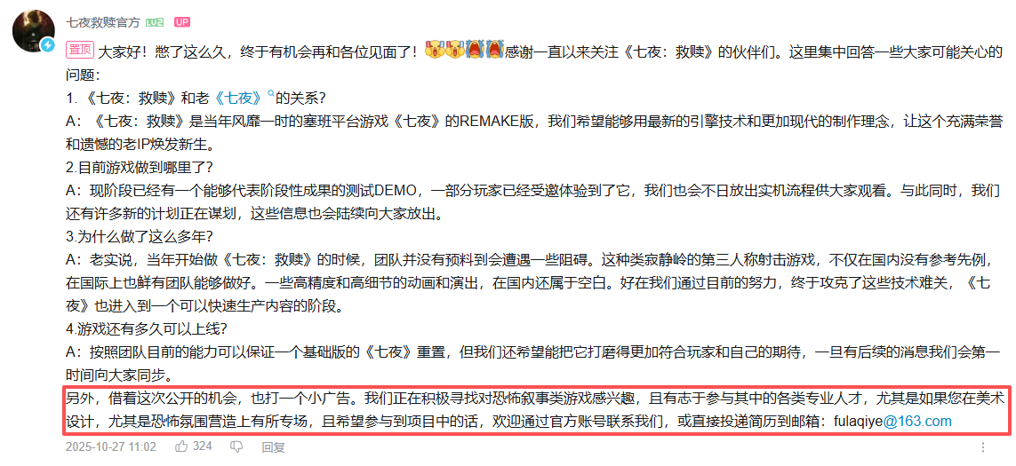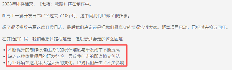 从项目进程来看,《七夜:救赎》的开发确实面临了一定的挑战。在2023年12月发布的第26篇开发日志中,团队坦言项目启动近四年来,遇到的困难远超预期,包括不断提升的制作标准带来的研发成本压力、缺乏大型项目经验导致的谨慎与纠结,以及行业环境波动的影响。