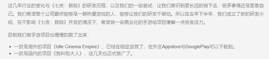 这也部分解释了为何开发日志的发布周期从早先的约两个月逐渐延长至半年乃至现在都没有再更新。不过,团队也强调他们仍在坚持开发,并通过成立新的研发小组,在不影响《七夜:救赎》主线开发的前提下,运营《Idle Cinema Empire》和开发国内项目《我叫包大人》等商业化手游,以期缓解项目的资金压力。