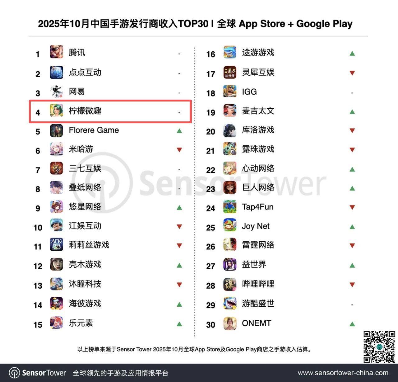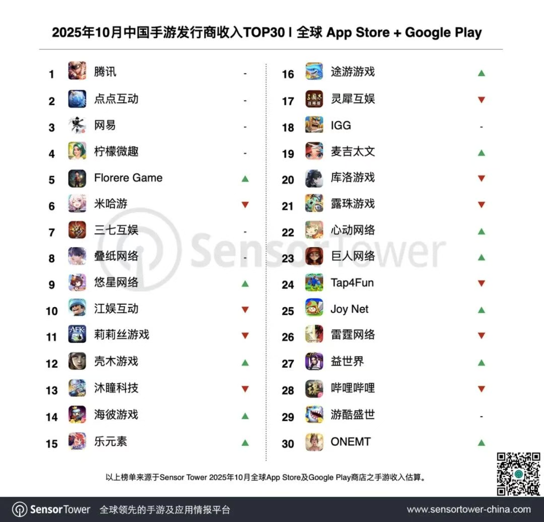 最近,Sensor Tower发布了2025年10月中国手游发行商在全球App Store & Google Play的收入排行TOP30。(下称TOP30,仅统计发行商收入,且不包括中国地区第三方安卓渠道)