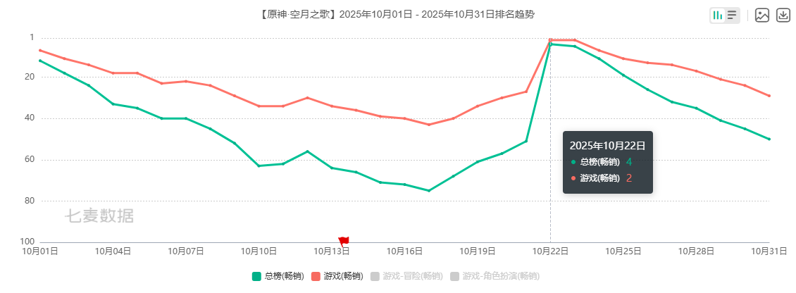 在新版本的带动下,《原神》10月收入环比上涨46%,在TOP20中排名第13。