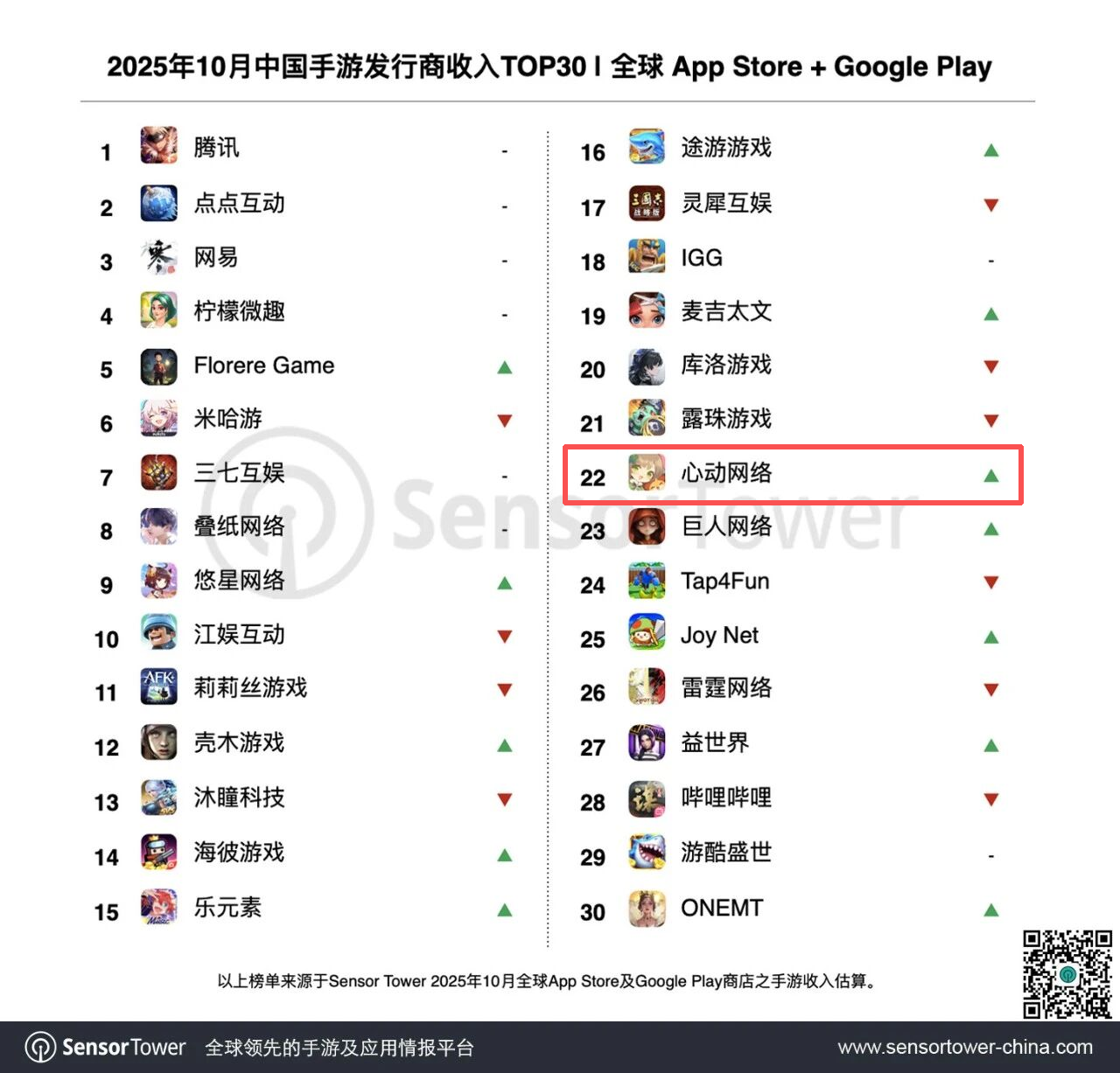 在多款手游的出色表现下,Florere Game 10月再度增长16%,跃居收入榜第5名;悠星网络10月收入环比激增54%,跻身收入榜第9名;心动网络10月全球收入则显著上涨30%,排名提升5位至收入榜第22名。
