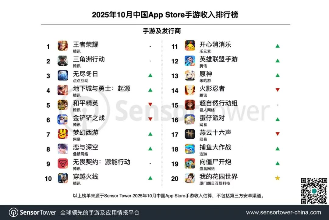 此外,Sensor Tower还公布了10月中国App Store手游收入排行TOP20(下称TOP20)。《王者荣耀》《三角洲行动》稳居本期收入榜冠亚军;《无尽冬日》升至第3;《原神》跻身第13;《我的花园世界》首次入围TOP20。