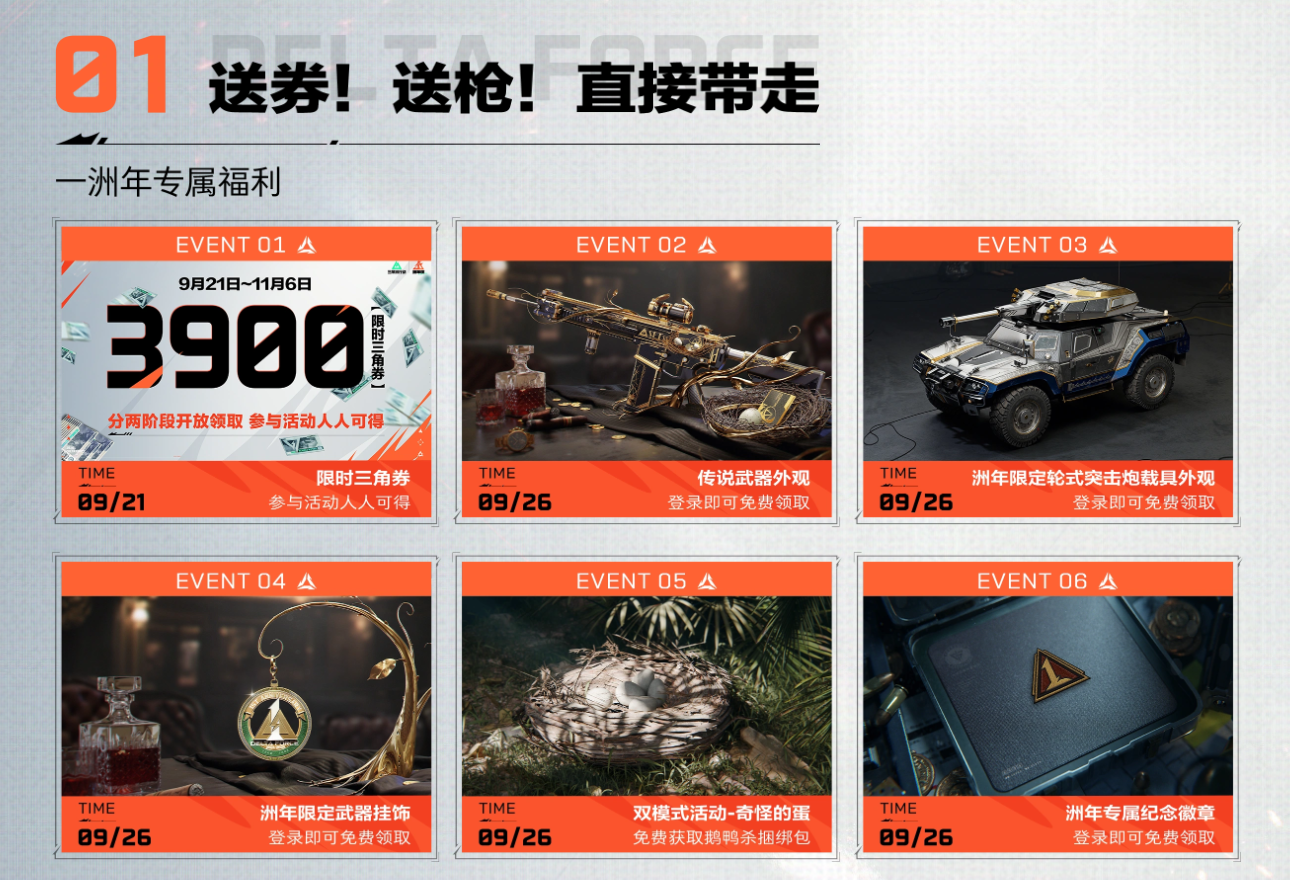 9月26日,《三角洲行动》迎来一洲年庆典,给玩家带来了各种专属福利,包括限时三角券、传说武器外观「SCAR-H战斗步枪-启航」、洲年限定轮式突击炮载具外观、限定武器挂饰、专属纪念勋章等。