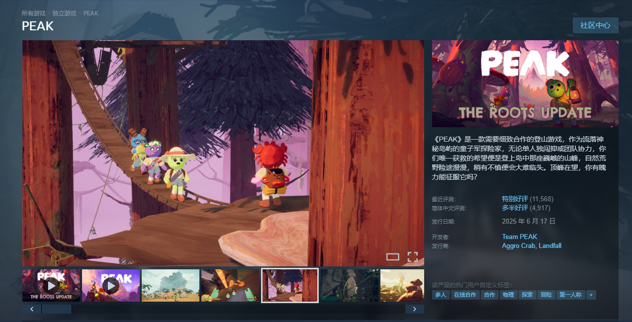第二个游戏就是《PEAK》,前段时间也卖得非常好的独立游戏,四人合作独立游戏,我觉得它是一个非常非常简洁的游戏,可能两三天内部做了这么一个游戏,然后没过几天这游戏就可以正式的玩了,它是一个非常简洁,但是又有游戏玩家核心的一些乐趣展现非常充分的这么一个游戏,我也比较喜欢这一类,就是很简洁的游戏。