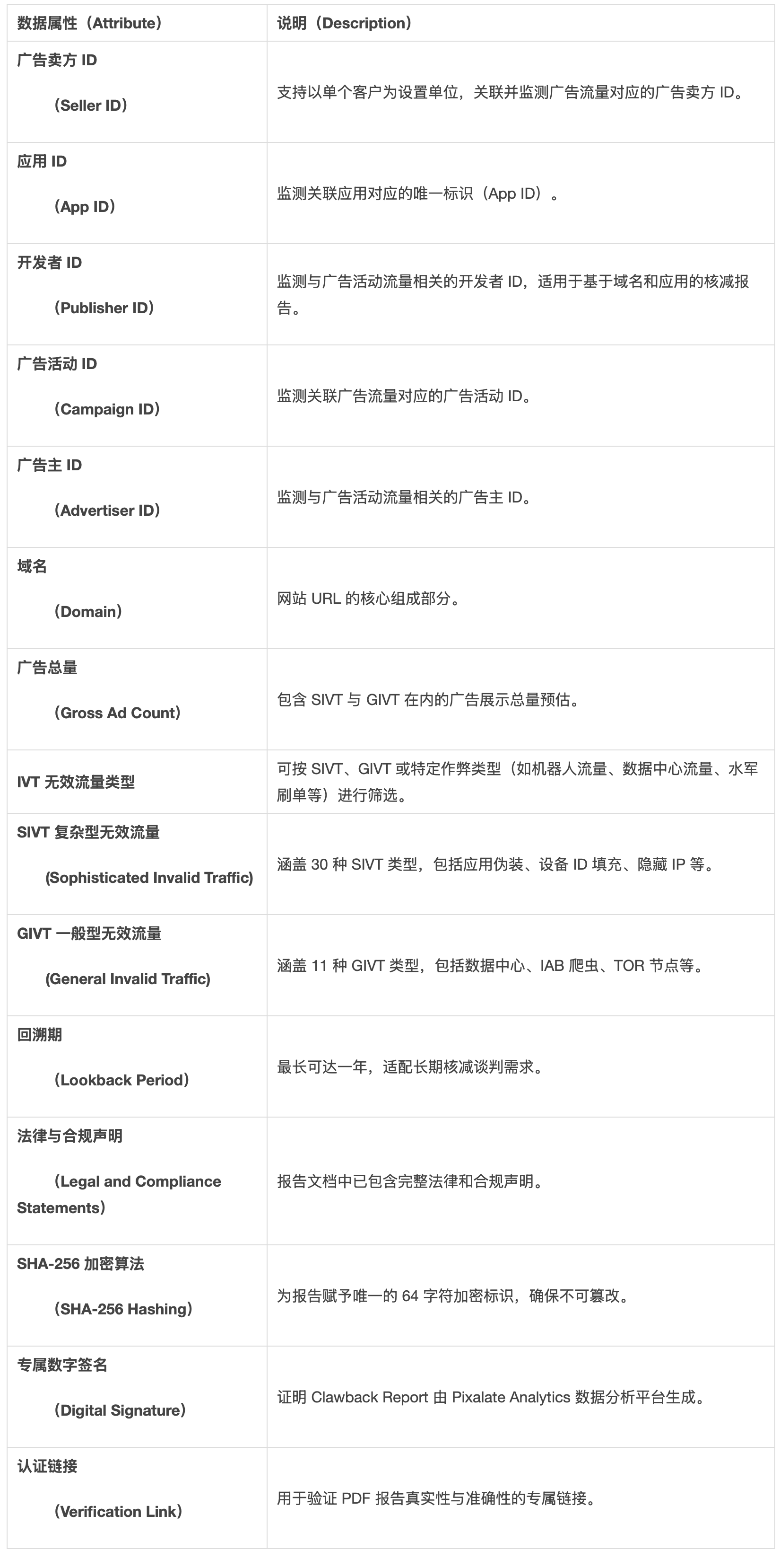 每份 Pixalate Clawback Report 均生成防篡改的带签名 PDF 文件,包含完整核减审计追踪记录,适用于程序化广告供应链路的核减验证。