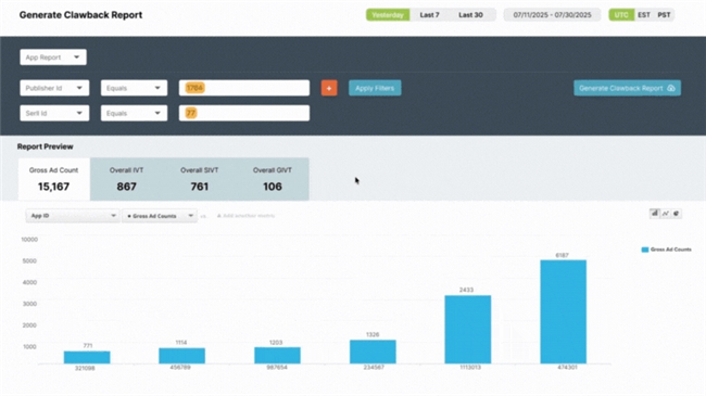 Pixalate 现推出广告行业首个 Clawback Report,通过Pixalate Analytics 数据分析平台即可获取该报告,大幅简化广告核减流程。该报告可生成防篡改的签名 PDF 文件,内含 IVT无效流量相关凭证,助力 SSP 和 DSP 在核减谈判中高效维权。