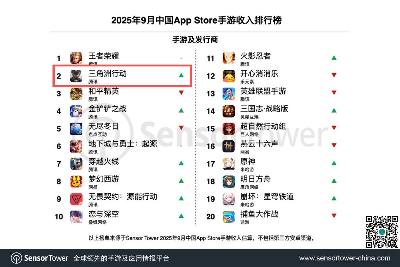 据SensorTower发布的数据显示,《三角洲行动》今年7月在国内iOS市场收入环比暴涨166%,成功创下历史新高;而在仅仅两个月之后,受新赛季“烈火冲天”与一周年庆典活动热度助推,游戏收入再度环比大涨76%,成功跻身当月国内App Store手游收入排行榜Top2。Q3财报当中,腾讯也用了“本季位居行业流水前三”的描述来形容《三角洲行动》的成绩表现。