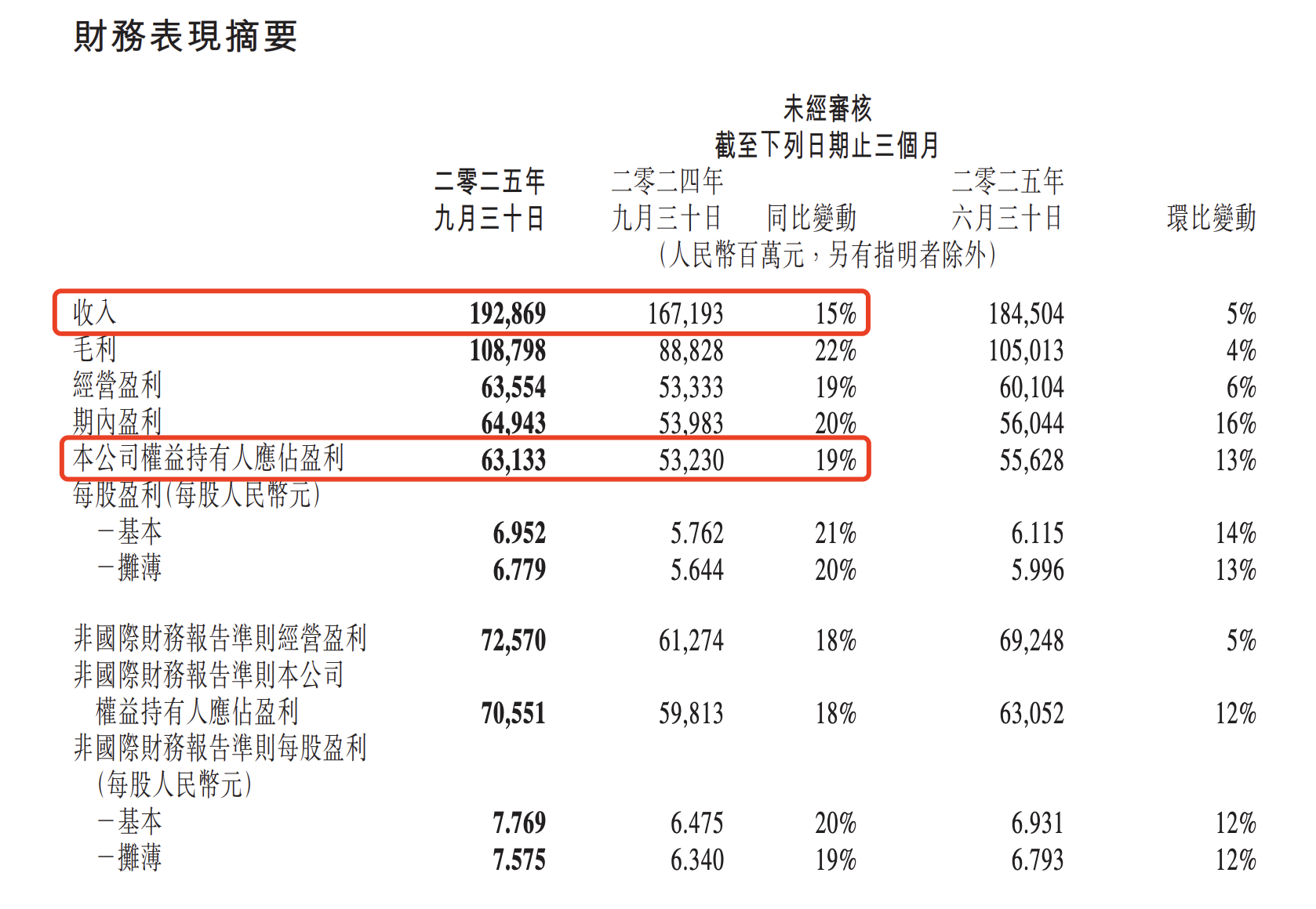 今日(11月13日)港股盘后,腾讯控股对外公布2025年第三季度财报,整体上看,第三季度腾讯依然保持着前两个季度的高速增长势头。据财报数据显示,在25年Q3期间,腾讯营收同比增长15%至1928.69亿元,超出此前金融机构预估的1875.07亿元;公司权益持有人应占盈利631.33亿,同比增长19%。
