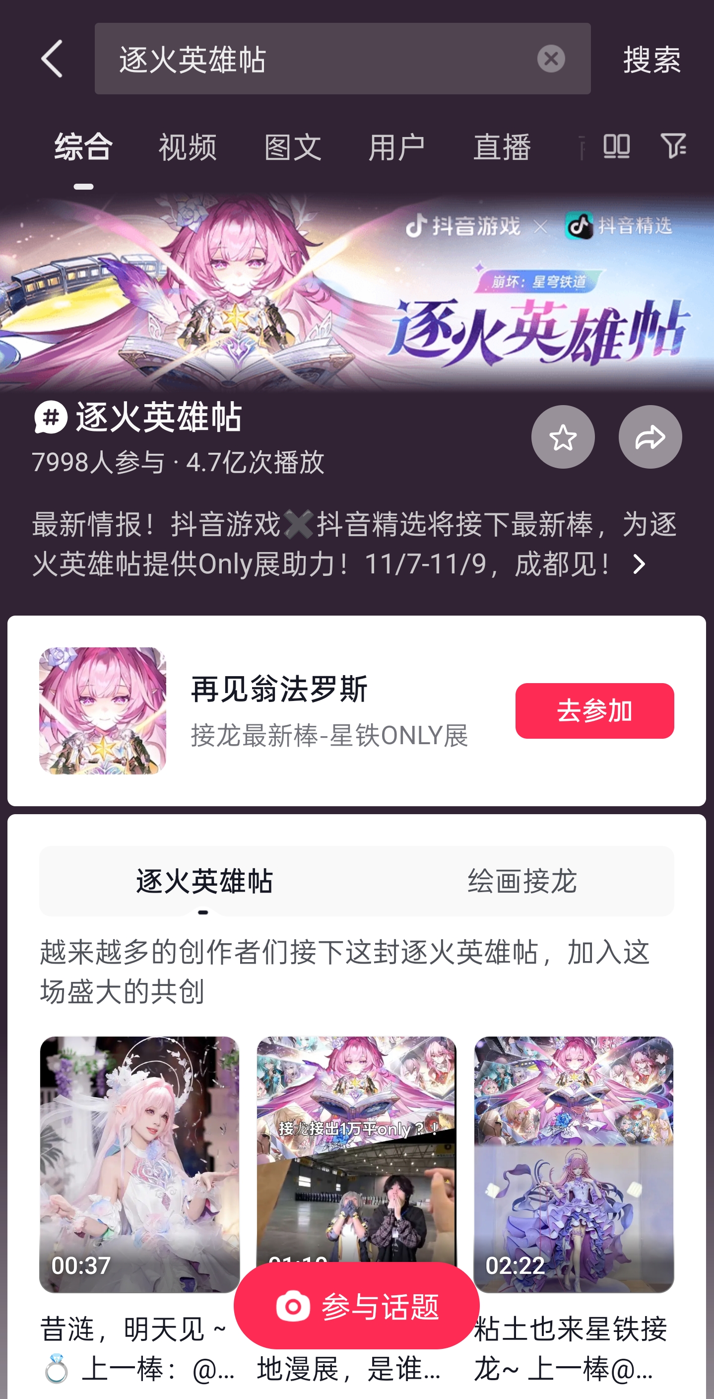 但大家显然低估了《崩铁》玩家想要参与其中的热情。截至接龙结束,这起名为“逐火英雄帖”的接龙活动已经累计近8000名创作者投稿,话题播放量超4.7亿。