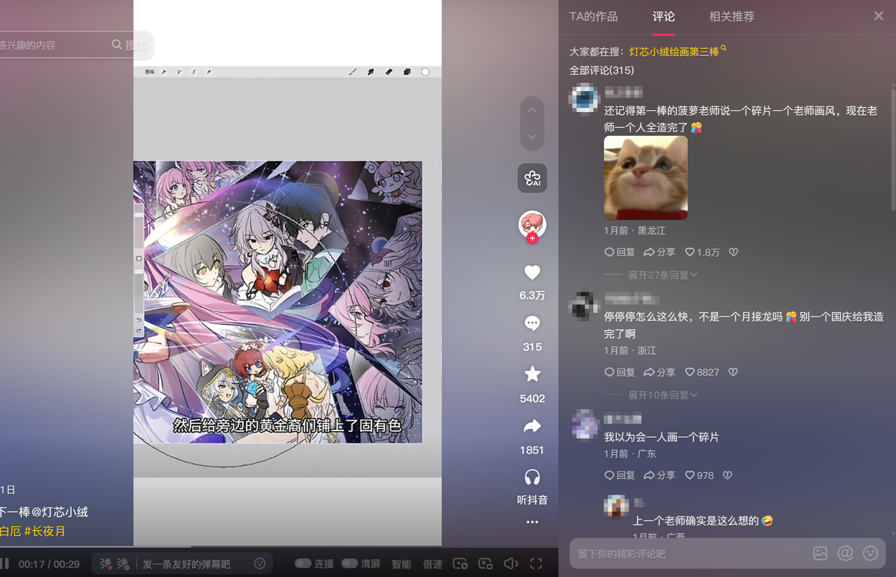 例如在作画初期,这张全家福二创就因为一些远超预期的“厨力放出”(创作者毫无保留的投入),让一开始计划画一个月的大昔涟在两天之内基本成图——