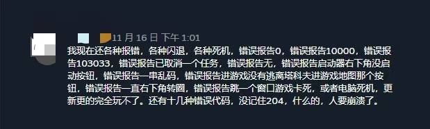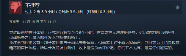 游戏正式上线后,很快就有玩家发现游戏无法正常游玩。要么因为下载失败、账号电话验证失败、无法启动等根本进不了游戏,要么进了游戏又因为角色创建、商人等各种Bug被踢出游戏。不少玩家到了半夜还没玩上,回头一看两小时已过,游戏也没法退款了,愤而打下差评。