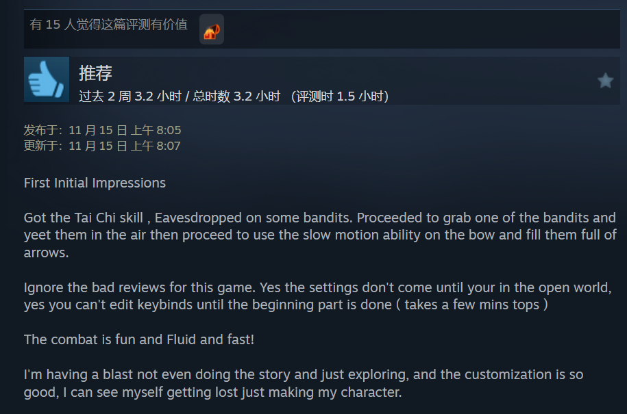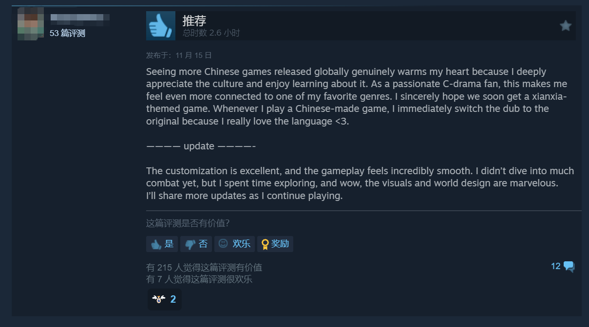 从游戏商城的评论区到Reddit、Kotaku等海外游戏论坛,我们能够发现,海外玩家们相当热衷于分享有关《燕云》游戏体验的心得,还对游戏中蕴含的中国武侠文化展现出浓厚的好奇心与探索欲望,甚至延伸成为对整个中国传统文化的向往与认同。