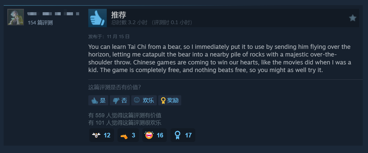 不少海外玩家也对《燕云》中的轻功、点穴、太极文化情有独钟:“从一头熊那里学会太极拳后,我立刻学以致用——把它扔飞过地平线。”