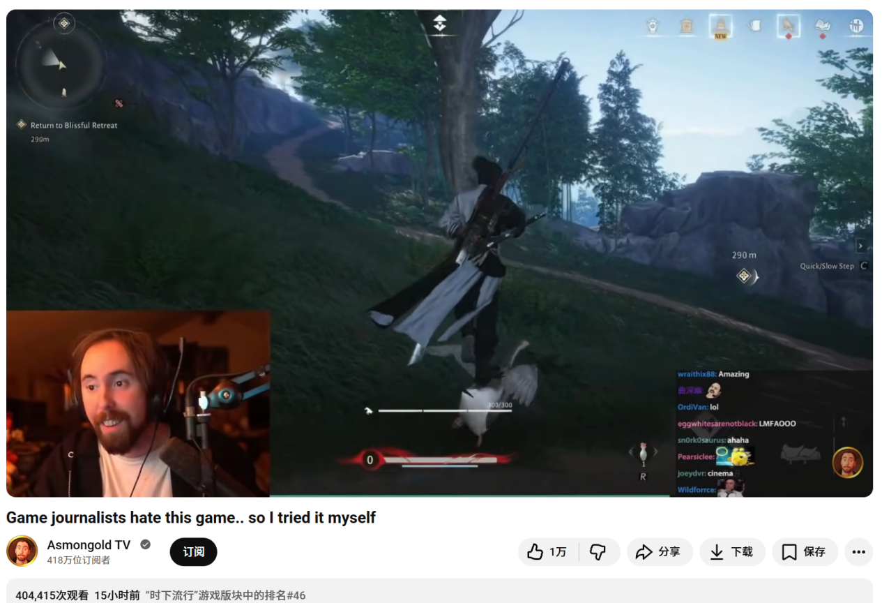 在各大海外直播平台,《燕云》中诸如村霸大鹅、悬赏海捕等独具中国特色的游戏意象体验,也为海外主播提供了源源不断的节目效果。拥有400万粉丝的YouTube主播Asmongold247(挑眉哥)从游戏开服起连续直播了四个多小时,以乐在其中的游玩表现,回击某些海外媒体的不实抹黑。