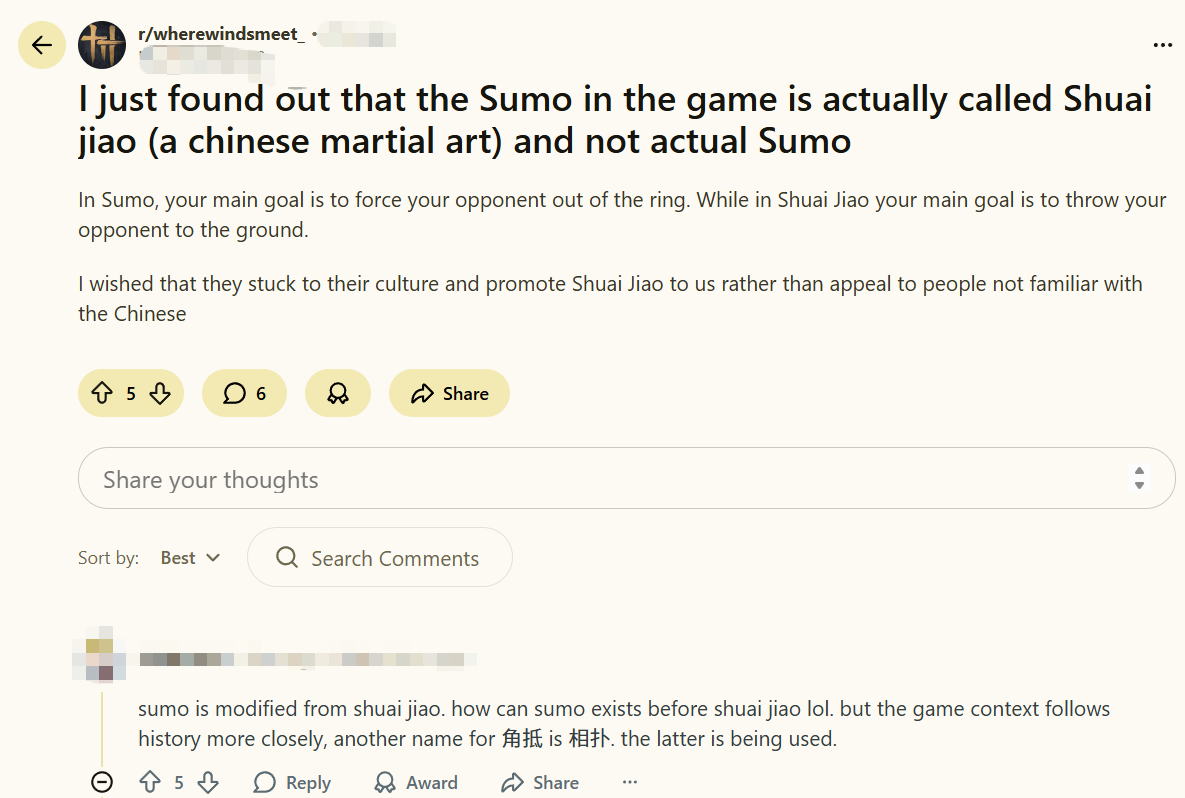 也有玩家在体验相扑玩法时,注意到其规则与日式相扑不同,最终目标并非将对手推离土俵,而是摔倒在地,进而引发了对中国历史上“角抵”渊源的讨论。