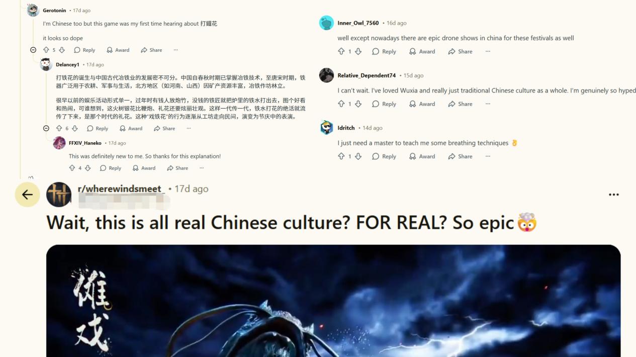 当海外玩家对游戏中打铁花、舞狮、傩戏、皮影戏等非遗表演惊叹不已时,既有中国玩家在评论区积极回应:“这些都是真实存在的传统文化!”,也有中国玩家坦诚表示自己其实是通过《燕云》才首次了解到某些非遗项目。