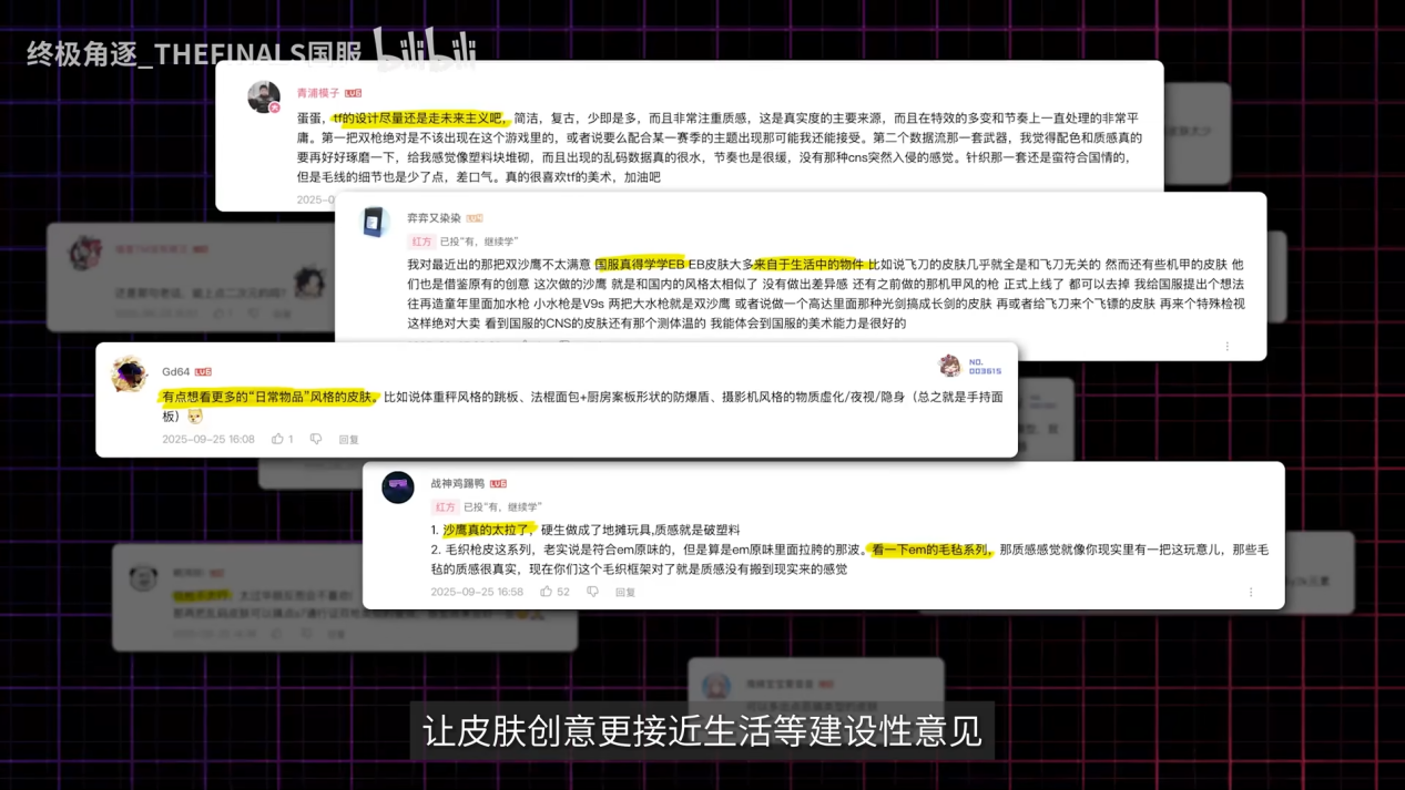 《终极角逐》的主美Migo,也通过运营团队收集到玩家在评论区对于皮肤外观、特效提出的优化建议,表示将在后续更新中积极采纳可行的方案。