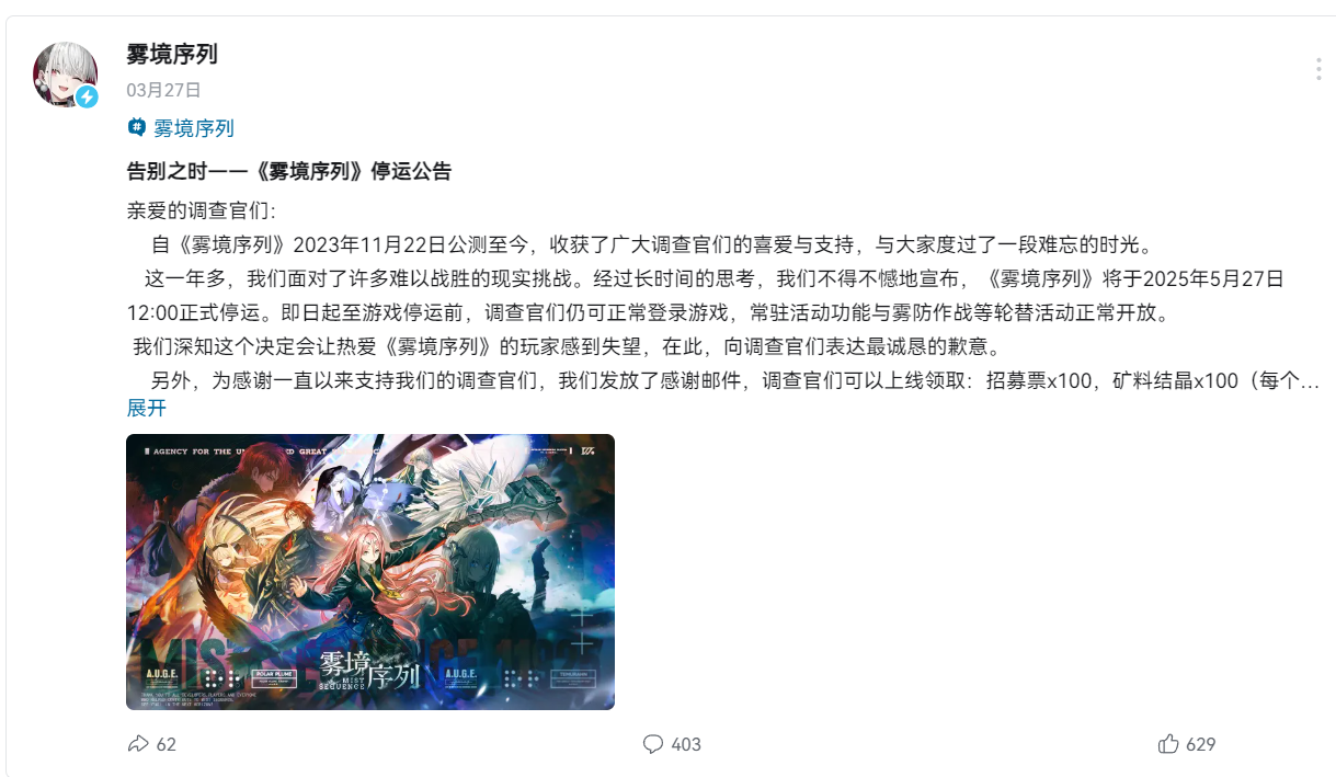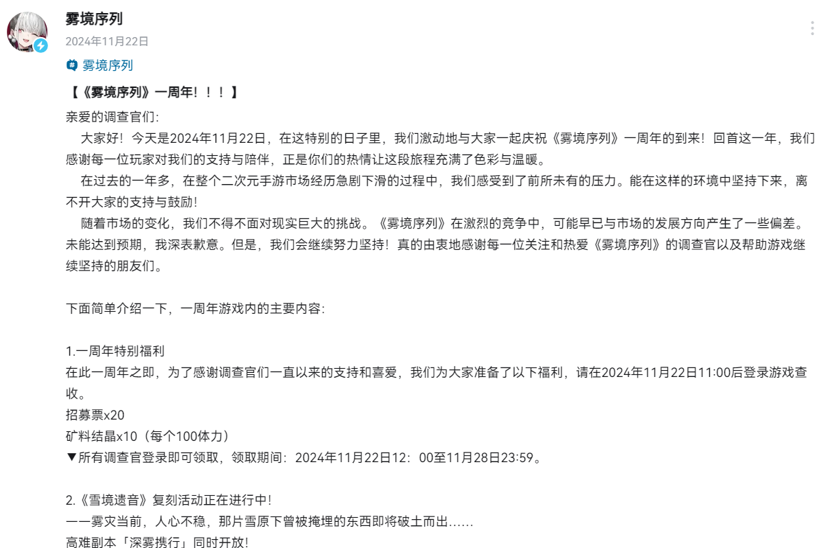 即便是像《雾境序列》这样,在宣布停服后依然有不少玩家在评论区底下表示惋惜,希望后续能够推出离线版本让自己重温游戏的美术与剧情,但对于几乎只剩一具“空壳”的星线网络,以及许多与之境况相似的二游团队而言,他们大概率也很难再有余力去给自己的作品送上一个体面的结局了。