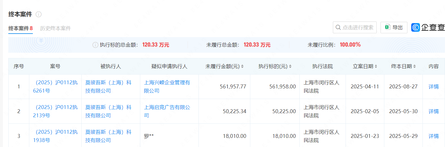企查查显示,星线网络截至目前仍有22起失信被执行人信息、9起终本案件信息,其中终本案件未履行总金额为648.37 万元,立案日期最早可追溯到2024年8月份。此外,公司去年的工商年报参保人数也从2023年的114人锐减至仅仅2人,几乎等同于全员解散。