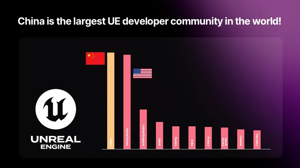 这其中也不乏大厂产品,像是腾讯的《穿越火线:虹》,米哈游也在最近曝光了第一款用UE5引擎开发的预研新作。眨眼间,中国也已经成为最大的虚幻引擎开发者社区。