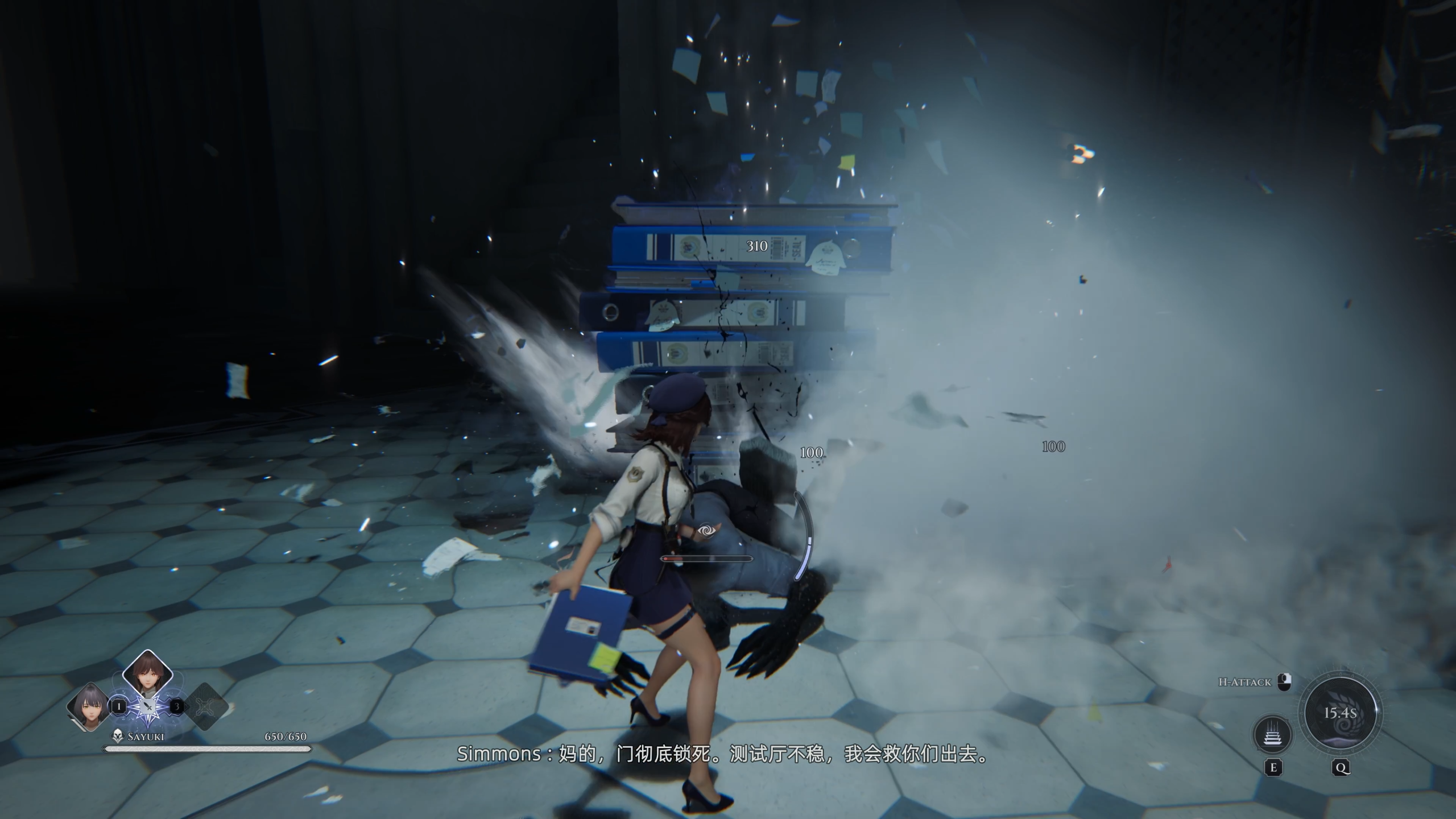 以游戏的看板娘“Sayuki”为例,当Sayuki普攻时角色将使用手中的警务文件进行物理攻击,等到小怪被角色吸引群聚时,玩家不仅可以使用小技能召唤放大版的文件堆砸落,还可以使用大招唤来大量的文件完成一次范围极大的空爆炸。