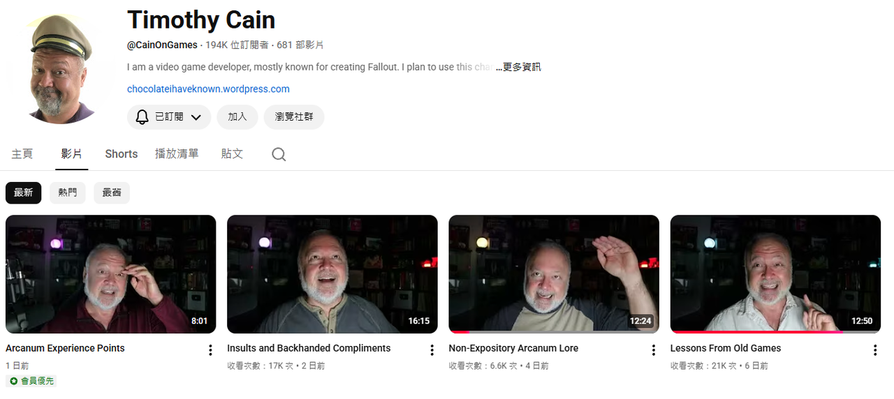 (辐射系列创始人之一Timothy Cain在油管上进行内容创作)