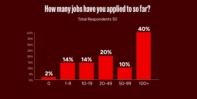 行业收缩不仅表现为大规模裁员,更意味着求职难度的陡然升级——即对于被裁员者来说,被裁不过只是地狱的开始。该报告显示,此24%的遭遇裁员者中近半数仍未找到工作,对其当前求职情况进行调查后发现:44%的失业者每周会花6-10小时寻找工作,40%已经投递了上百份简历,犹如发传单。