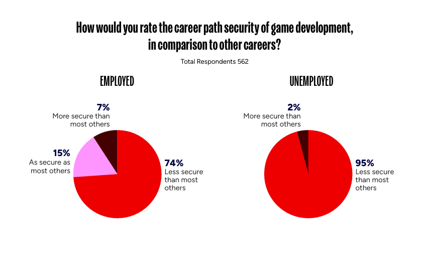 在这样的裁员风潮下,当从业者们被要求对比其他职业评估游戏开发的稳定性时,近74%的在职者认为游戏开发比其他行业更缺乏稳定,这一数字在失业者中则高达95%,总体受访者中有80%认为这是“稳定性低”的行业。