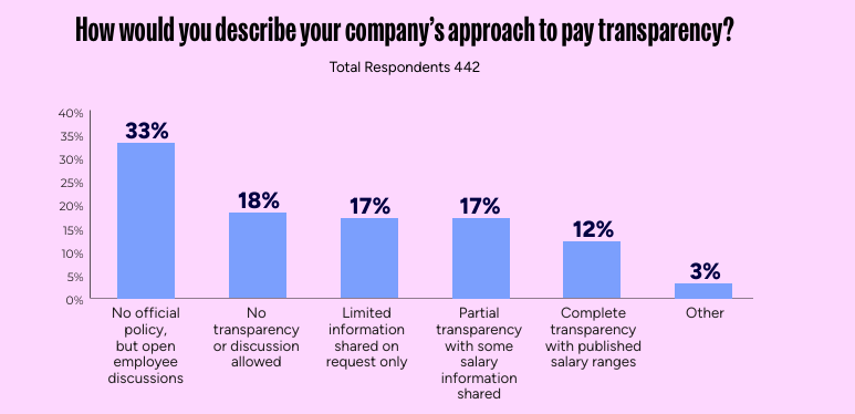 在美国工作的人员,依据《国家劳工关系法》(NLRA)享有一项非正式保护的权利 —— 即便雇主总部位于美国境外,他们也有权讨论自己的薪资。不过,近五分之一(18%)的受访者表示,其工作场所 “不允许薪资透明化或相关讨论”。其中,视觉艺术行业从业者中高达29%称工作场所禁止薪资讨论。