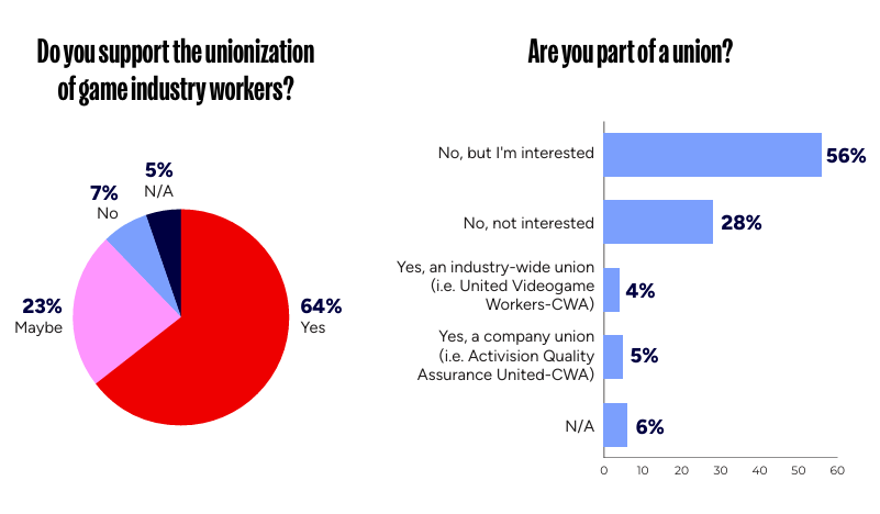 (左:是否支持游戏行业工作者成立工会;右:是否为工会成员)