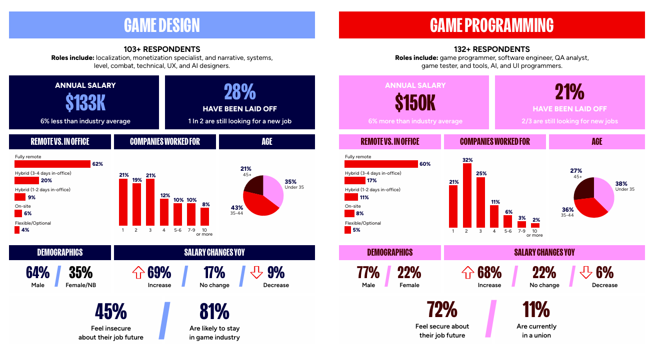 即使找到了工作,从业者们仍面临着裁员风险,一年一家公司,这从来不是笑话——尤其是对于创意领域从业者而言。调查显示,音频、游戏设计或视觉艺术领域工作者中,32%在过去十年内任职过至少五家公司(而编程、商务或运营领域这一比例仅为 13%)。