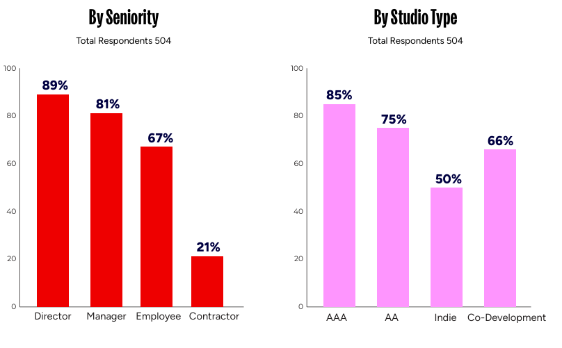 (游戏行业年薪中超10万美元的占比:左为不同职位,右为不同类型工作室)