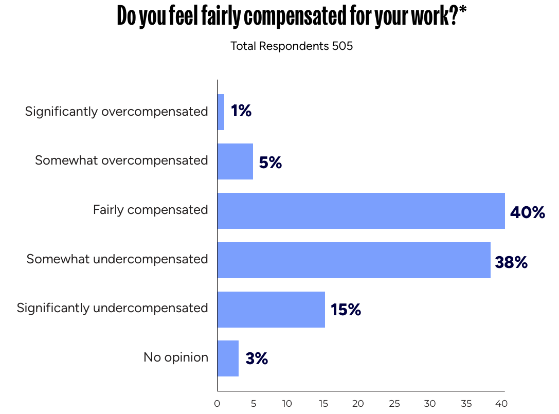 而当被问及为何承担额外工作时,超过半数(57%)的受访者表示是因为需要额外收入。其次是创意成就感(52%)、职业发展(31%)和项目多样性(30%)。