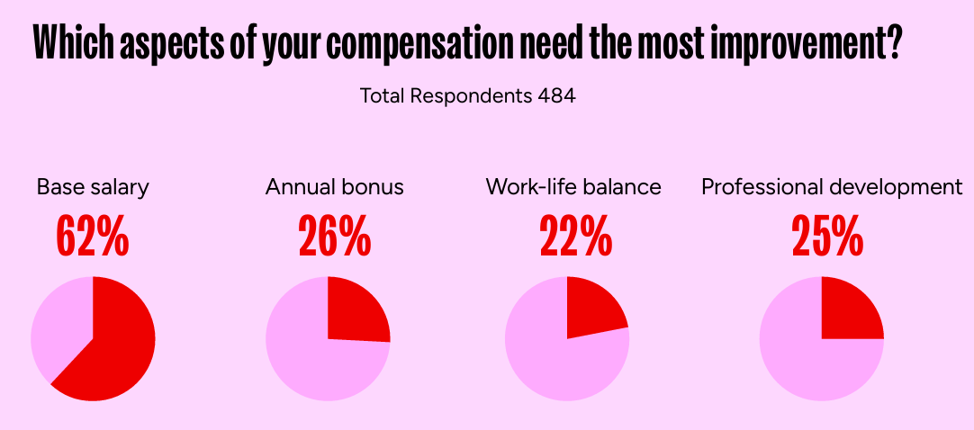 (你认为补偿的哪些方面需要改善?从左到右分别是基本薪,年终奖,工作与生活平衡以及职业发展)