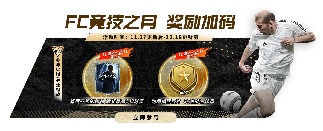 11月27日-12月11日,参与实时对战/进攻对战将能获取额外挑战者代币S7,同时获赠【齐祖的赠礼】道具,勇于参与FC竞技之月活动。