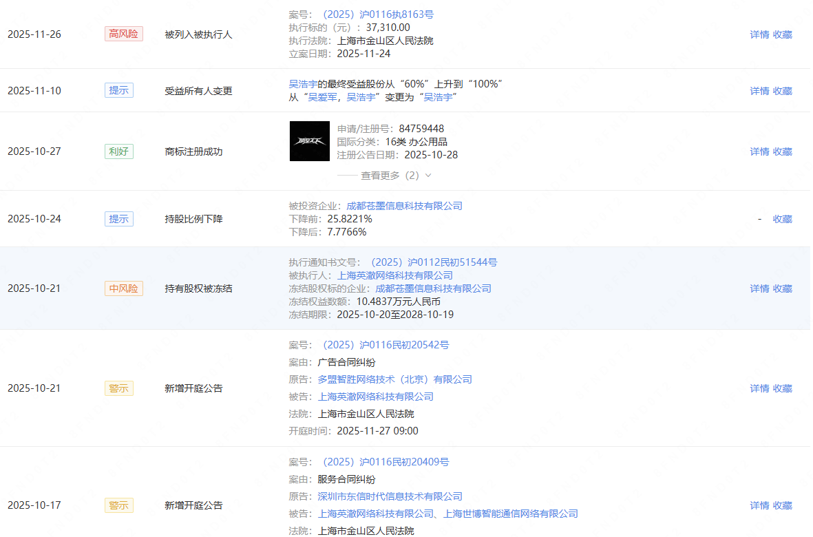 在刚刚过去的11月当中,英澈也被列入了被执行人名单。