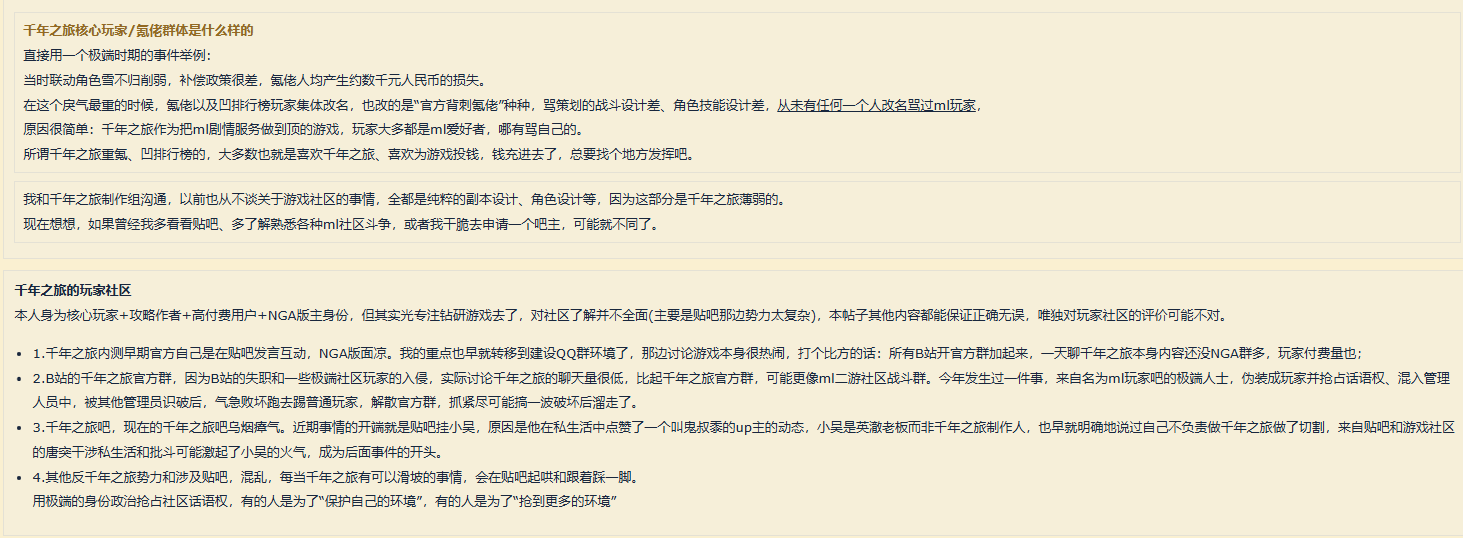 但在23年上线后运营一年多的时间里,《千年之旅》在文案、美术之外的部分却饱受诟病,多次引发玩家的不满。后续这一产品也曾深陷到二游圈闹得沸沸扬扬的“ML议题”中心,英澈老板吴浩宇,常被玩家们称作“小吴/牢吴”,也经常在QQ群、B站个人号上与玩家交流,其发言曾在各大二游主流讨论平台上引发过议论。