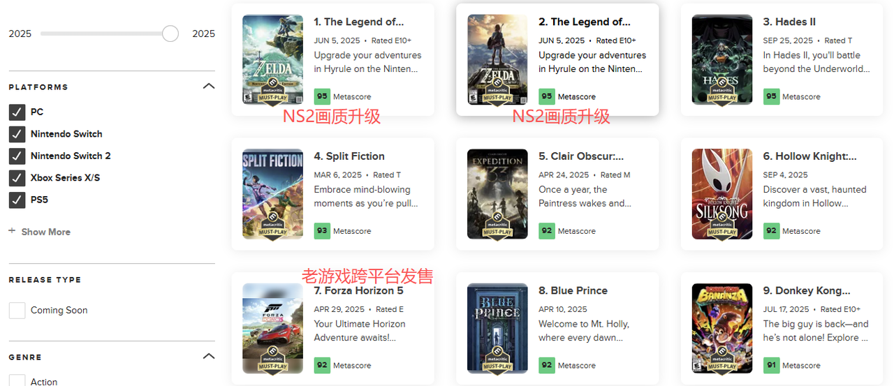 这一点在历年来的预选名单上都体现得较为明显,今年亦是如此,除了标注出来的个别游戏之外,绝大多数metacritic媒体高分游戏,都进入了各大头部奖项的候选名单当中。