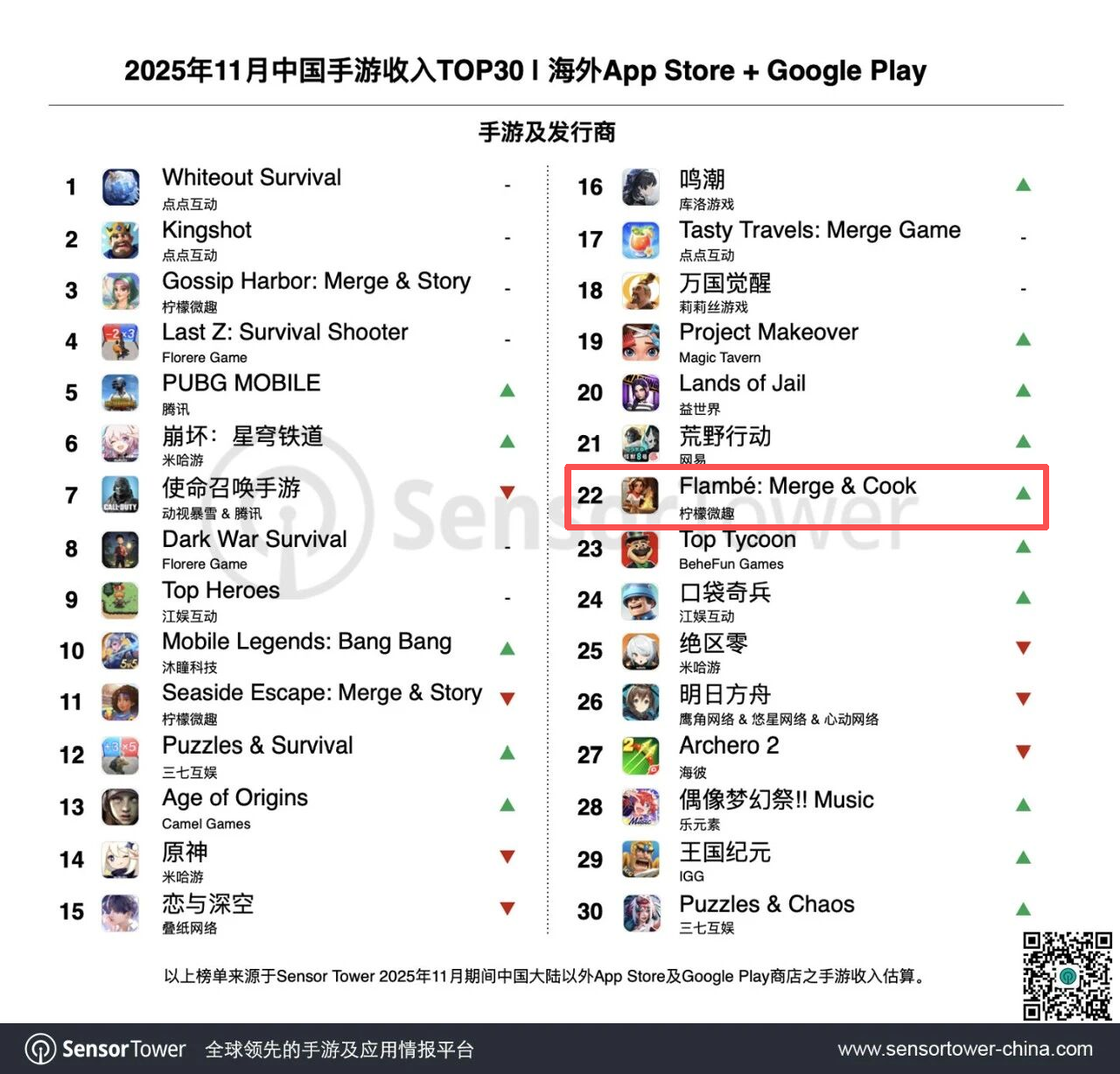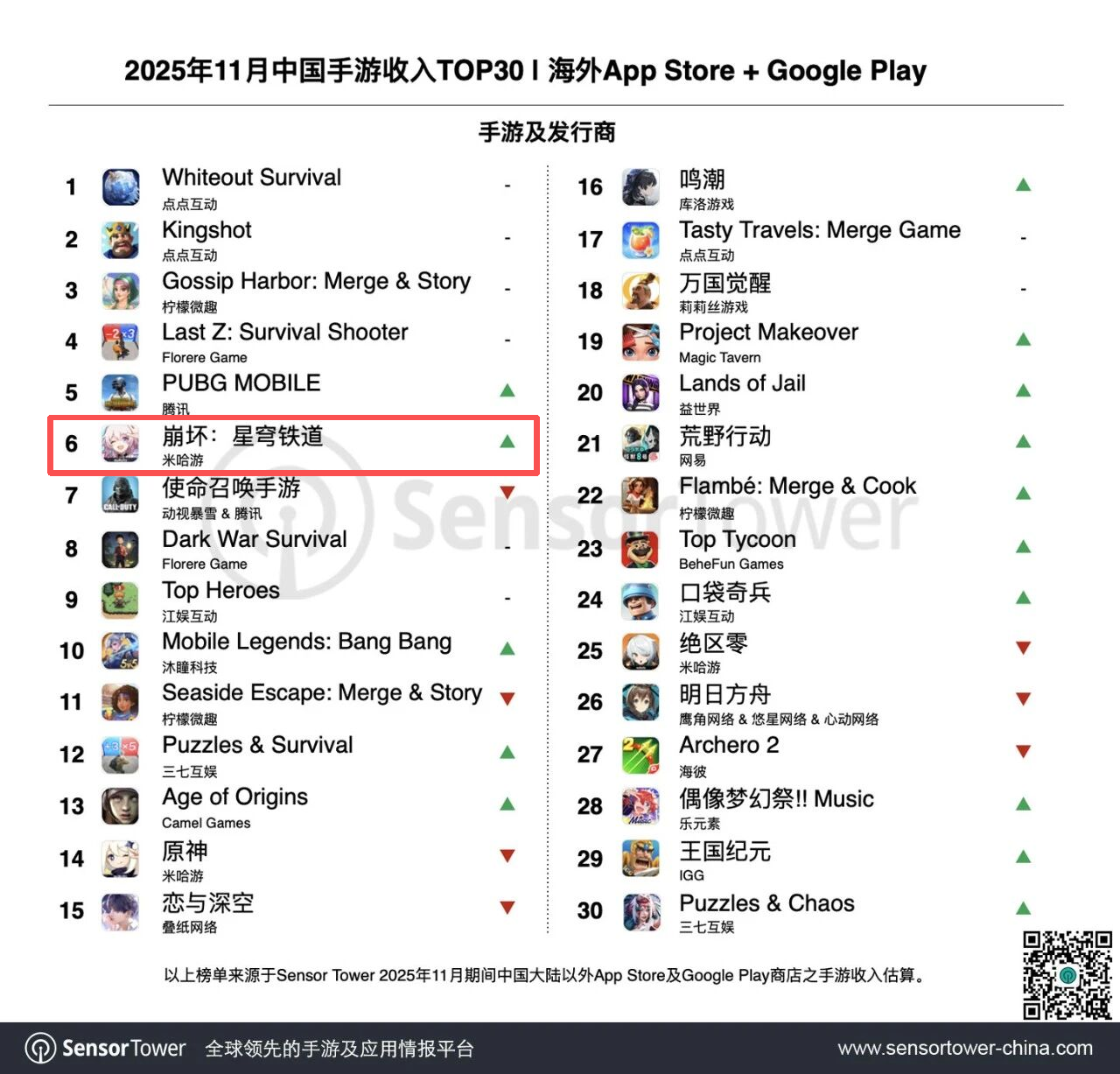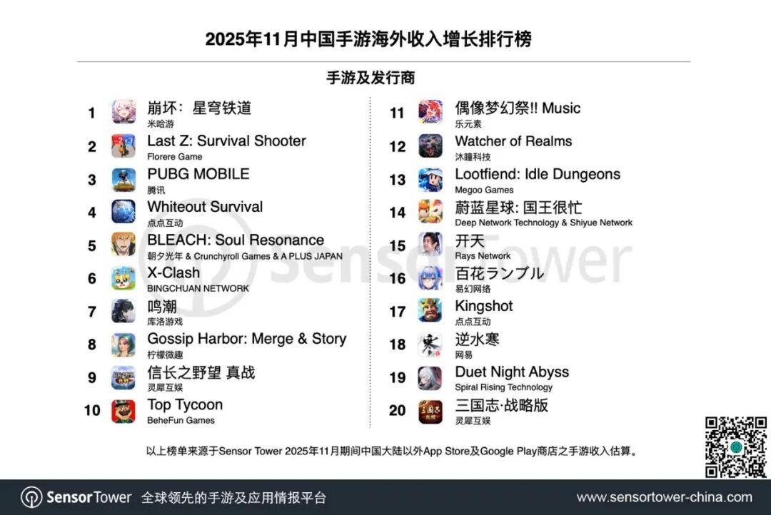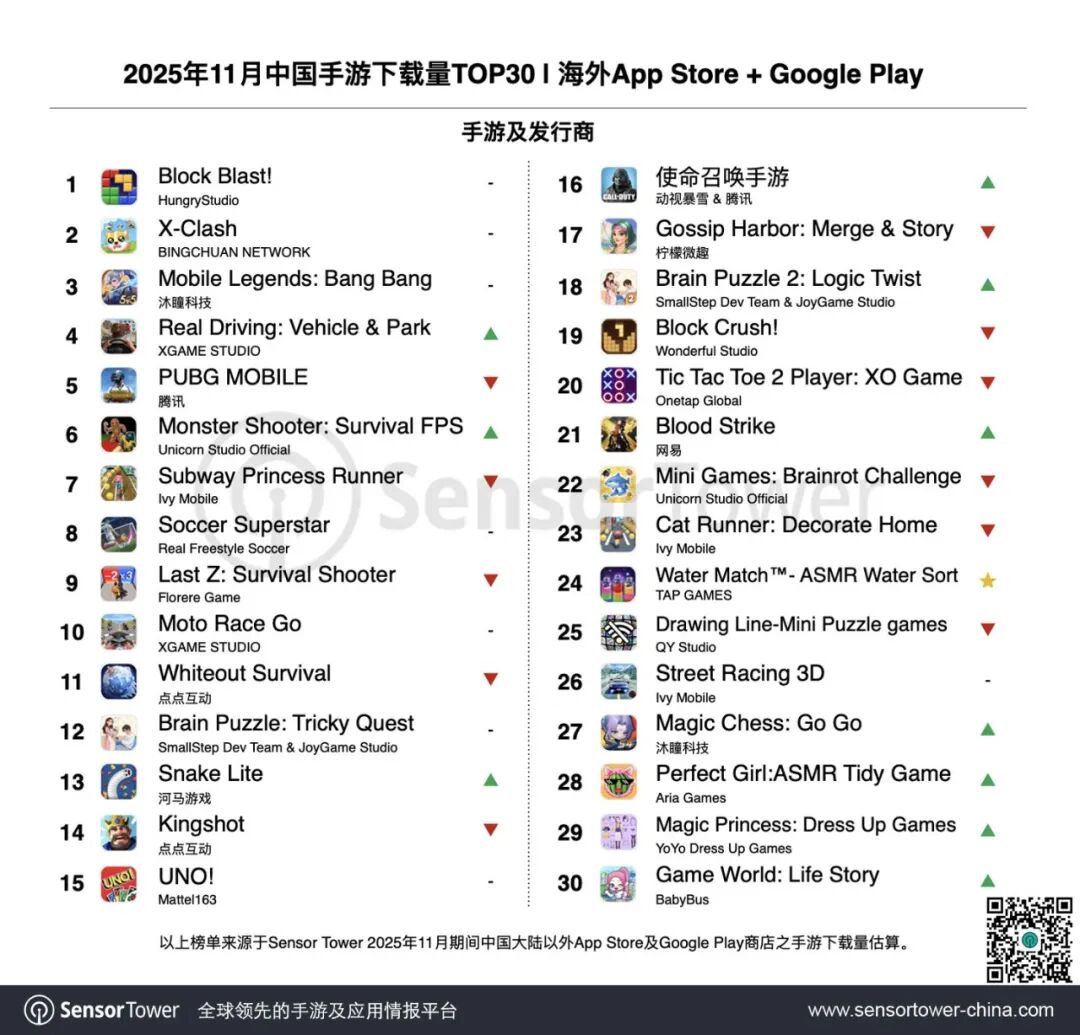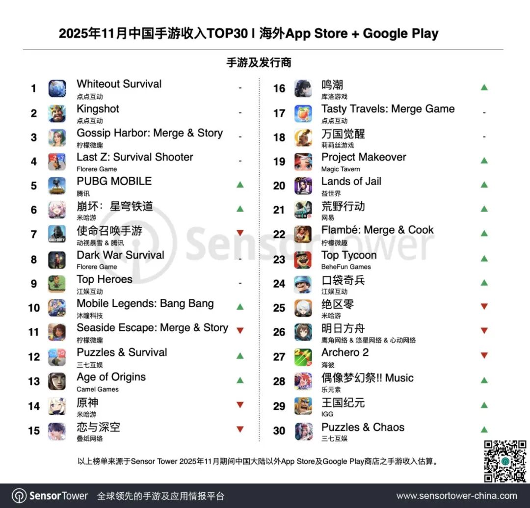 最近,Sensor Tower发布了2025年11月中国手游产品在海外市场收入排行TOP30(以下简称收入榜,仅统计应⽤商店IAP预估值,不包括⼴告变现收⼊和中国地区iOS及第三方安卓渠道收入)。