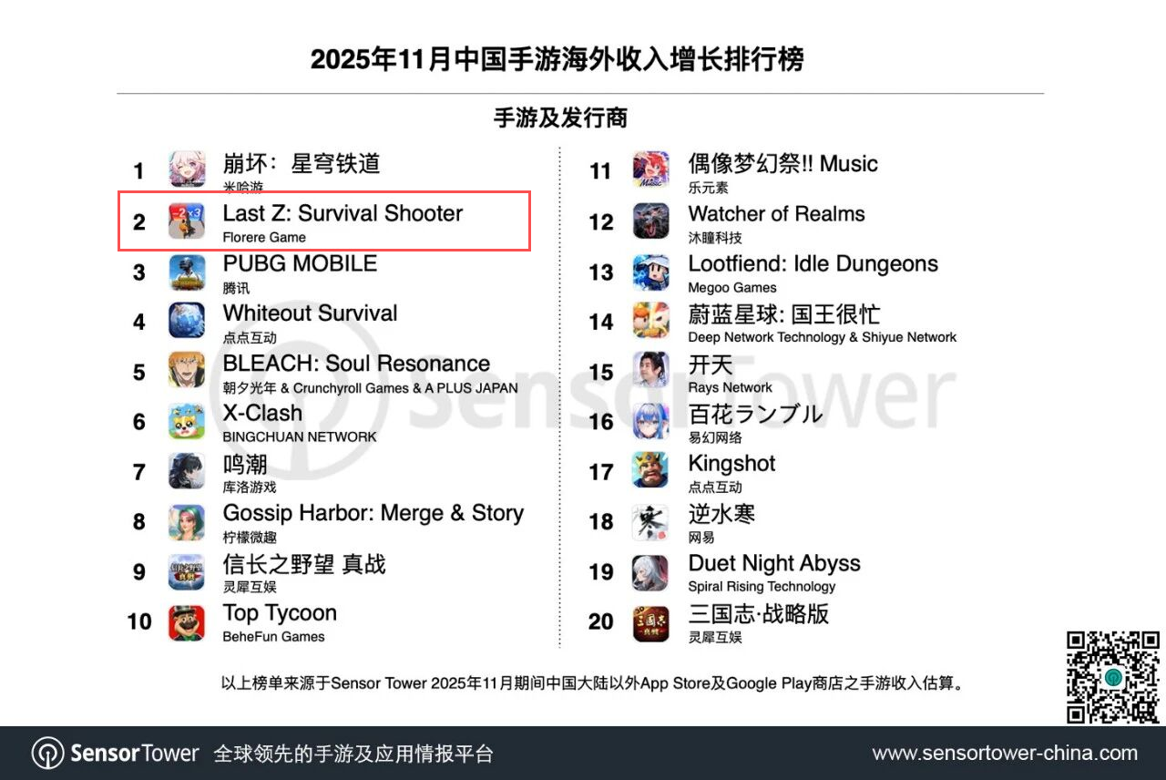 具体来看,Florere Game旗下末世题材生存策略手游《Last Z: Survival Shooter》11月收入环比增长11%,稳居收入榜第4名和增长榜第2名。