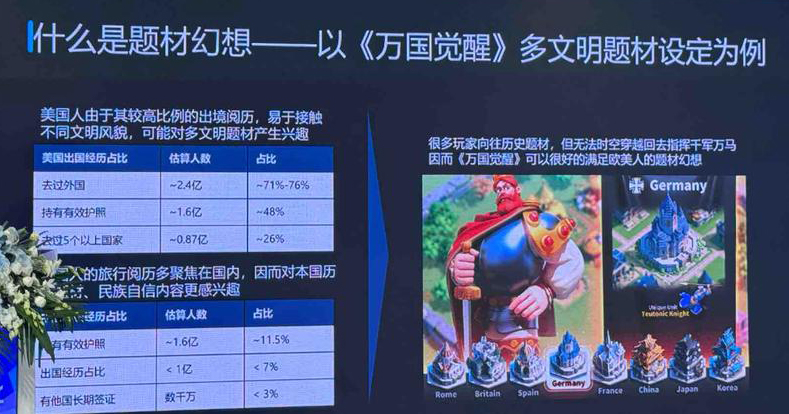 但是美国由于没有太长的历史,再加上本身出境比例非常高,去接触像埃及、欧洲、拉美等各种各样的文化,所以他们会天然对多文化题材感兴趣,这可能也是《万国觉醒》当时成功的一个原因。除了游戏本身的品质和偏即时战斗的设定玩法之外,它的题材设定也是对欧美出海起到非常关键的作用。