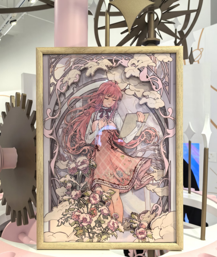 在走廊尽头,由点滴时间构建而成的展架上,可以看到各种由不同工艺、材质重新诠释的经典原画。六周年的主神套装被做成了细腻的彩瓷画,而十月和慕夏的联动原画则以雕刻画的形式呈现,不同工艺实物的质感承载着匠心。