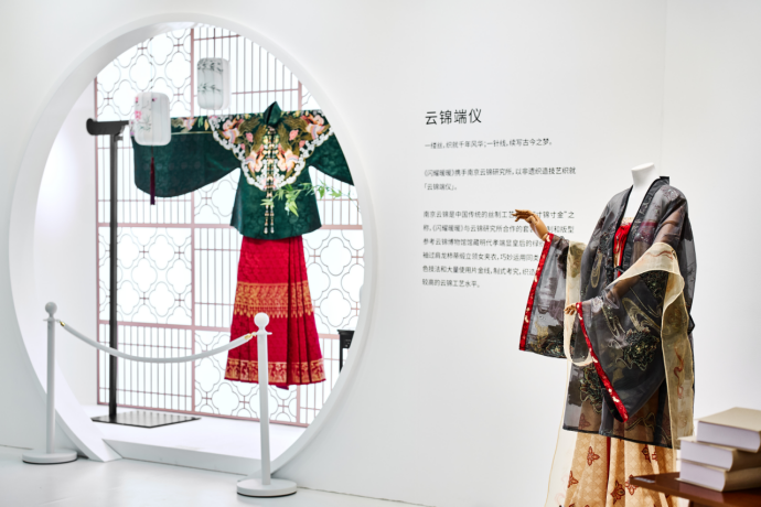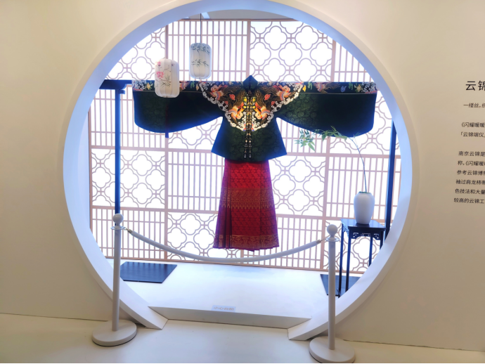 而说到联动和实物,先前《闪耀暖暖》与南京云锦研究所共同织造的「云锦端仪」也得以在现场展出。工作人员介绍,该套汉服源自被誉为“寸锦寸金”的中国传统丝织工艺,制式考究,织造细腻,总价值超过百万人民币。