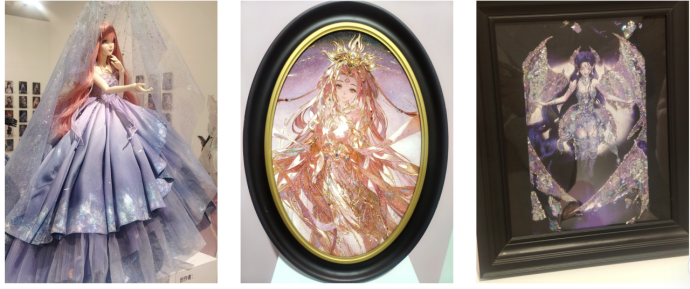 而摆在它们旁边的,则同样是一系列出自玩家之手的作品:有精致小巧的BJD娃衣,也有运用了掐丝珐琅、螺钿画等非遗技艺精心制作的工艺插画。