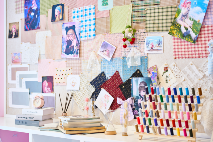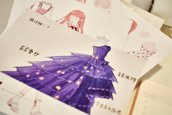 如果还嫌不够,线下复刻的暖暖小屋一定能满足你的好奇。屋内不仅挂有各类布料、丝线与色卡,桌面上还摊开着暖暖亲手绘制的、从历代暖系游戏初始服装到「星之海」礼服的珍贵手稿,仿佛暖暖真的在这里生活着。